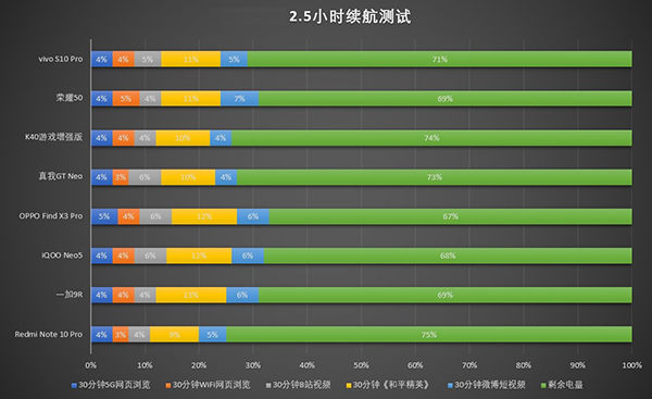 原本以為續(xù)航肯定是要墊底了,不過經(jīng)過愛搞機2.5小時的續(xù)航測試,剩余電量71%,對比其它測試過的機型處在中游水平,這當(dāng)中除了天璣1100的功耗控制以及vivo本身的優(yōu)化外,可能也與其90Hz屏幕較今年主流120Hz屏幕要略為省電有關(guān)。