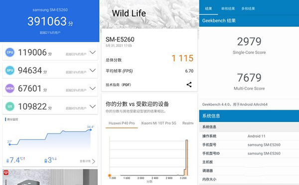 在安兔兔測試中,三星Galaxy F52 5G獲得了391063分的性能成績;其在3DMark Wild Life測試中則獲得了1115分的成績;而在Geekbench測試中三星Galaxy F52 5G則獲得了2979分的單核成績和7679分的多核成績。整體來看,三星Galaxy F52 5G完全可以滿足用戶日常的使用需求。