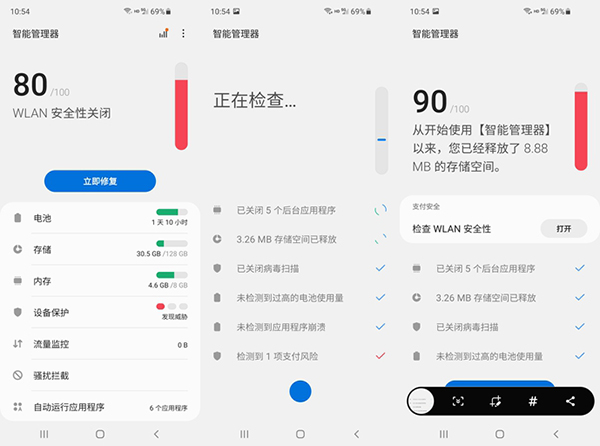 而對(duì)于大家日益關(guān)注的安全方面,其內(nèi)置的三星智能管理器可以幫助手機(jī)更好的優(yōu)化電池續(xù)航、清理手機(jī)空間、提升手機(jī)性能、保障手機(jī)安全、攔截騷擾來(lái)電和短信等。