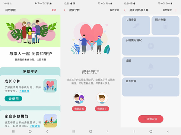 而對(duì)于家長(zhǎng)來(lái)說(shuō),還可使用 “成長(zhǎng)守護(hù)”服務(wù)遠(yuǎn)程查看孩子手機(jī)使用情況,培養(yǎng)孩子良好的用機(jī)習(xí)慣。此外,還能設(shè)立“家庭步數(shù)目標(biāo)”、設(shè)置到家服務(wù)和家人生日提醒等貼心小功能。