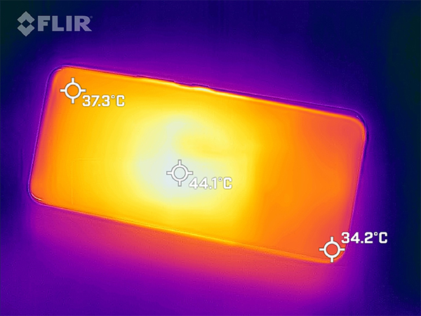 同時(shí),我們也記錄了20輪3D Mark Wild Life Stress Test測(cè)試之后,手機(jī)的溫度表現(xiàn),可以看到,手機(jī)正面最高處為44.1℃,位于屏幕中央,屏幕兩側(cè)則維持在30多℃的樣子,整個(gè)熱源的分別,跟手機(jī)的中置散熱架構(gòu)也是基本一致的。