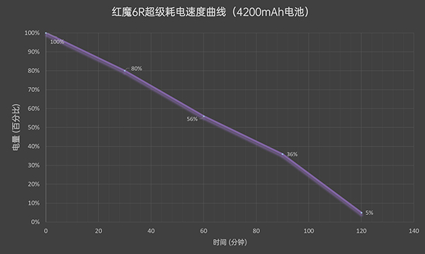 在超級(jí)耗電測(cè)試下,紅魔6R堅(jiān)持了120分鐘到5%,需要注意的是,這項(xiàng)結(jié)果是基于CPU一直處于滿載的情況下獲得,考慮到我們?nèi)粘J褂煤土疗習(xí)r間,因此這個(gè)數(shù)據(jù)要換算為倍數(shù),所以得出紅魔6R有著4個(gè)多小時(shí)的持續(xù)使用時(shí)間,注意是持續(xù)使用,并非日常熄屏、回消息等。