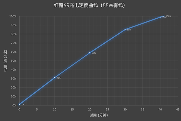 經(jīng)過實(shí)際測(cè)試,紅魔6R耗時(shí)41分鐘充至100%,其中10分鐘充入了31%電量,30分鐘就充入了85%電量,充電速率尚可接受,而且支持邊玩邊充。