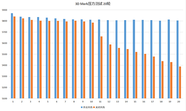 同時(shí)我們也使用了偏向于GPU性能測(cè)試的3D Mark進(jìn)行了20輪的壓力測(cè)試,部分驍龍888手機(jī)在此項(xiàng)測(cè)試時(shí)會(huì)由于溫度過高,無法完成20輪的壓力測(cè)試。開啟風(fēng)扇,實(shí)測(cè)紅魔6S Pro壓力測(cè)試的表現(xiàn)較為不錯(cuò),最佳分?jǐn)?shù)為5870分,最低分?jǐn)?shù)為5802分,20輪測(cè)試的分?jǐn)?shù)基本呈現(xiàn)一條直線,穩(wěn)定性98.8%,性能表現(xiàn)十分穩(wěn)定。