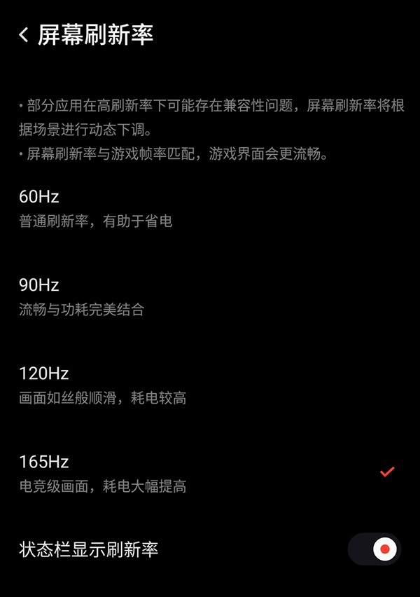 需要說明的地方有兩個(gè)。其一,紅魔6S Pro的屏幕刷新率一共提供60Hz、90Hz、120Hz和165Hz四檔,并沒有設(shè)置智能切換檔位,不過即便手動(dòng)選擇高刷檔位,手機(jī)在某些應(yīng)用場(chǎng)景下,也還是會(huì)根據(jù)實(shí)際兼容性需求自動(dòng)調(diào)節(jié)。