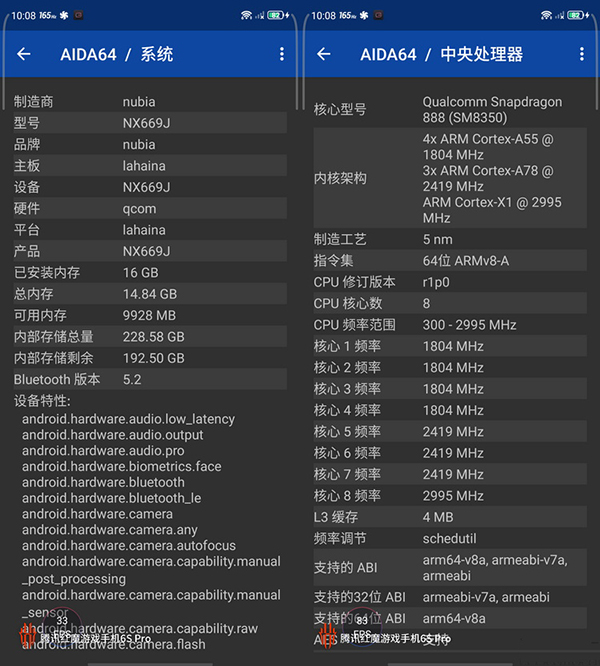作為紅魔旗下的新一代產(chǎn)品,紅魔6S Pro理所當(dāng)然地采用了當(dāng)前已發(fā)布的旗艦移動平臺驍龍888 Plus。從AIDA64所識別出的系統(tǒng)信息中不難看出,與驍龍888相比,驍龍888 Plus的Cortex-X1超大核主頻提升到了3GHz,同時(shí)其GPU驅(qū)動的版本也進(jìn)行了更新。
