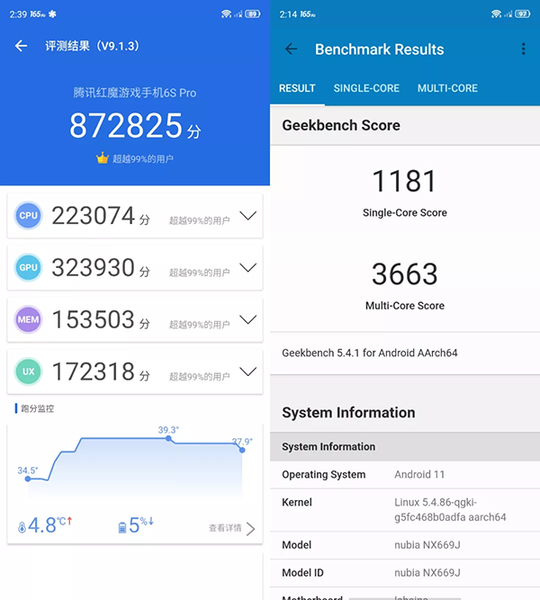 紅魔6S Pro采用了高通驍龍888+ +LPDDR5+UFS3.1的搭配,屬于目前的性能最強(qiáng)三件套,當(dāng)然,這也是游戲手機(jī)的基本操作了。從跑分軟件可以看到,安兔兔得分87萬+,Geekbench5單核得分1181,多核得分3663,和我們此前測試過的驍龍888+機(jī)型相比,優(yōu)勢比較明顯,紅魔的性能優(yōu)化做得還是很到位的。