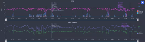 從實(shí)測數(shù)據(jù)可以看到(開啟最高畫質(zhì)),整個(gè)游戲過程都可以保持在55fps左右,最低處也有43.9fps,整體幀率相對平穩(wěn)。