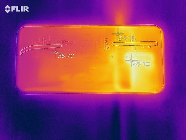 用熱成像儀測試,機(jī)身溫度已經(jīng)達(dá)到了45℃,這個(gè)結(jié)果有點(diǎn)出乎意料,以散熱為賣點(diǎn)的游戲手機(jī),機(jī)身溫度竟然比其他驍龍888+平臺(tái)機(jī)型還要更高?