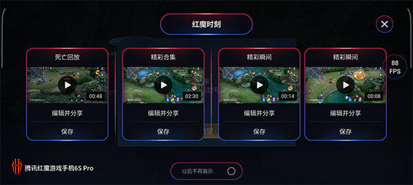 值得一提的是這一次紅魔6S Pro上加入的紅魔時刻功能,在開啟這一功能之后,打游戲的時候手機就會自動幫你記錄一些精彩的操作瞬間。就拿《王者榮耀》來說,在啟動游戲之后,它就會自動幫我們錄制各種反殺、陣亡視頻,在游戲結(jié)束的時候自動生成精彩操作的集錦;如果你操作不慎被單殺了,還能看看下飯回放,預(yù)防對手的下一波gank。