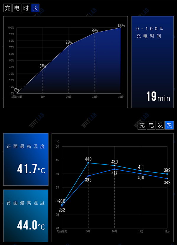 在120W功率和風(fēng)冷降溫的加持下,不到半小時(shí)的時(shí)間就能把這塊4500mAh的電池從零給「灌」到滿,我們實(shí)驗(yàn)室實(shí)測(cè)僅5分鐘就能充上37%,一刻鐘就能到達(dá)92%,最終在19分鐘達(dá)到100%的完全滿電狀態(tài),接近官方宣稱的17分鐘充滿。