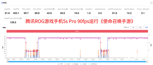 首先,我們讓騰訊ROG游戲手機5s Pro運行熱門網(wǎng)游《使命召喚手游》,結(jié)果如上圖所示,騰訊ROG游戲手機5s Pro可以輕松做到全程90fps運行《使命召喚手游》,即使復(fù)雜團(tuán)戰(zhàn),也沒有出現(xiàn)大的幀率波動。