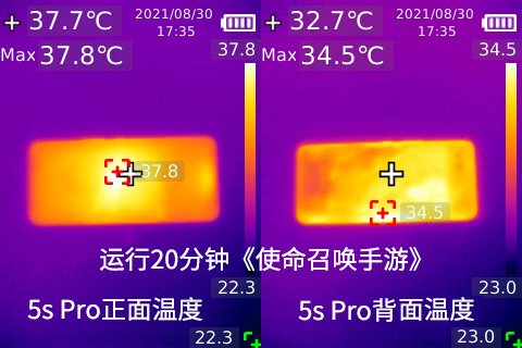 在游戲的同時,我們也測試了騰訊ROG游戲手機5s Pro的溫度,結(jié)果如上圖所述,持續(xù)運行《使命召喚手游》20分鐘時,騰訊ROG游戲手機5s Pro機身正面最高溫為37.8℃,背面最高溫度為34.5℃。從這一點,可以感受到騰訊ROG游戲手機5s Pro強悍的散熱能力。