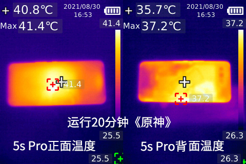 溫度方面,持續(xù)運行《原神》20分鐘時,騰訊ROG游戲手機5s Pro機身正面最高溫為41.4℃,背面最高溫度為37.2℃。這種“低溫”,也從側(cè)面說明了為何騰訊ROG游戲手機5s Pro可以不主動鎖幀全程流暢運行《原神》。