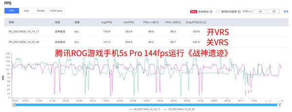 結(jié)果如上圖所述,運行《戰(zhàn)神遺跡》開啟VRS功能后,騰訊ROG游戲手機5s Pro的平均幀數(shù)達(dá)到了104.9fps,反觀關(guān)閉該功能后,騰訊ROG游戲手機5s Pro的平均幀率降到了101.2fps,并且再未觸及144幀的高幀率。由此可見,VRS功能確實可以大幅提升騰訊ROG游戲手機5s Pro的游戲幀率表現(xiàn)。