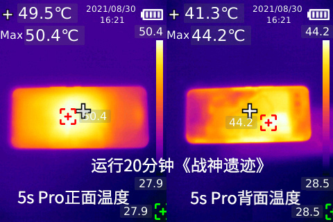溫度方面,由于《戰(zhàn)神遺跡》的畫面更為復(fù)雜,持續(xù)運行20分鐘時,騰訊ROG游戲手機5s Pro機身正面最高溫為50.4℃,背面最高溫度為44.2℃,比運行上兩款游戲稍高一些,但并沒有達(dá)到燙手的程度,依然可以繼續(xù)玩下去。從這一點,不得不讓人驚嘆騰訊ROG游戲手機5s Pro對于手機散熱的控制能力之強。