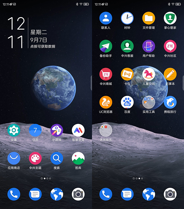 圓圓的icon圖標(biāo)很討巧,我還是比較喜歡圓形設(shè)計的,看起來比方形的圖標(biāo)更舒服。原生主題下是星球壁紙,角度我感覺是站在了月球上仰視地球,值得一提的是解鎖屏幕后以及從應(yīng)用返回到桌面時,背景中的地球有一個動態(tài)升起的特效,有點(diǎn)科幻感。