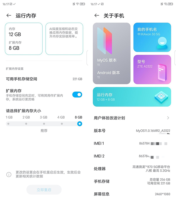 而手上搭載MyOS11的中興Axon30 5G屏下攝像手機(jī)同樣也支持內(nèi)存融合功能,我們最高可以設(shè)置8GB的內(nèi)存融合,加上機(jī)器本身的12GB運(yùn)存,可以實(shí)現(xiàn)相當(dāng)于20GB的運(yùn)行內(nèi)存。此外,MyOS還可以通過AI算法深度壓縮和動(dòng)態(tài)交換應(yīng)用內(nèi)存數(shù)據(jù),進(jìn)一步提升內(nèi)存實(shí)際使用率,因此無論在日常使用還是多任務(wù)操作時(shí),總體感覺都挺流暢,幾乎不存在卡頓的現(xiàn)象。