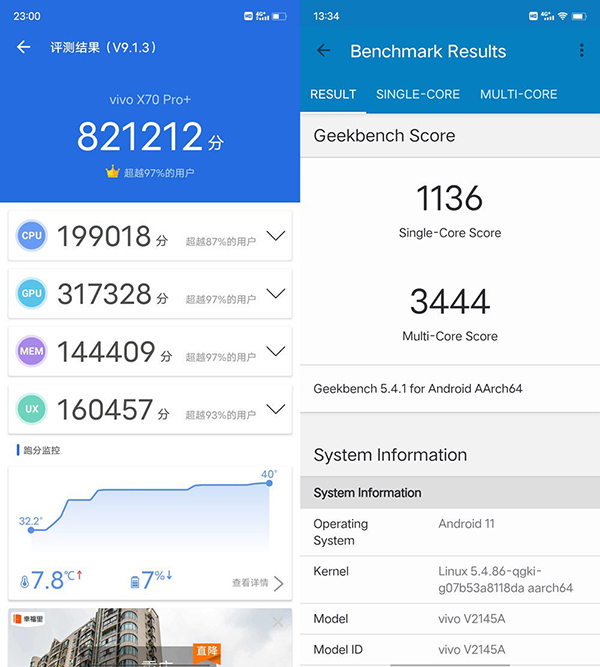 跑分測(cè)試:測(cè)試綜合性能的安兔兔可以跑出82萬分;測(cè)試CPU性能的Geekbench5測(cè)試,單核1136,多核3444。兩個(gè)軟件測(cè)試出來的值都屬于驍龍888 Plus的正常水平,在整個(gè)安卓手機(jī)市場(chǎng),這樣的結(jié)果算得上耀眼。