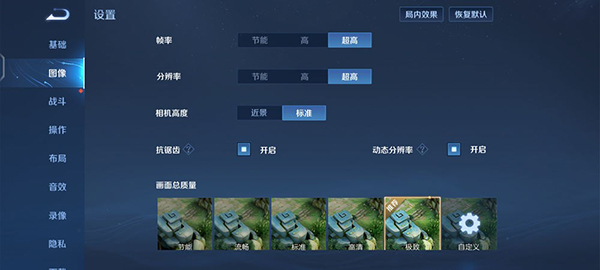 游戲時(shí)的圖像設(shè)置所有選項(xiàng)都開的最高,幀率和分辨率選擇“超高”,畫面總質(zhì)量選擇“極致”。