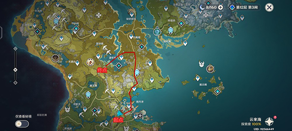 設(shè)計(jì)的璃月跑圖測(cè)試路線如上圖所示,起點(diǎn)是璃月港背后山上這個(gè)傳送錨點(diǎn),終點(diǎn)是淥華池遺跡門口,整條線路變化多樣,水陸空都有了。