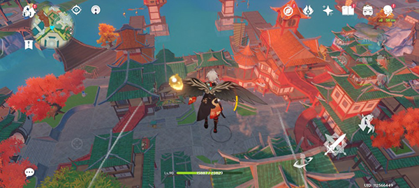 跑圖時(shí),游戲內(nèi)的時(shí)間調(diào)到傍晚,這個(gè)時(shí)間點(diǎn)景色很美。另外出發(fā)之后,我們會(huì)速降,然后從璃月港的頭頂?shù)涂章舆^。之所以介紹這么細(xì),是因?yàn)椴煌臅r(shí)間,不同的高度渲染也會(huì)有差異。我們選擇的這條線路,渲染比較強(qiáng)。
