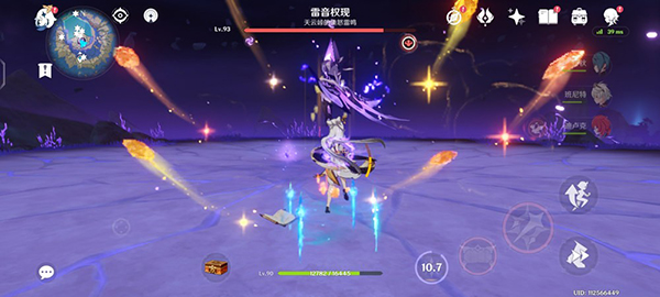 第二輪戰(zhàn)斗選擇版本更新后出的Boss雷音權(quán)現(xiàn),該Boss技能比較華麗,很多技能都接近全屏,對(duì)于手機(jī)的GPU來說是個(gè)不小的挑戰(zhàn)。為了不過早的結(jié)束戰(zhàn)斗,我們選擇了練度不太高的角色作為主輸出位。