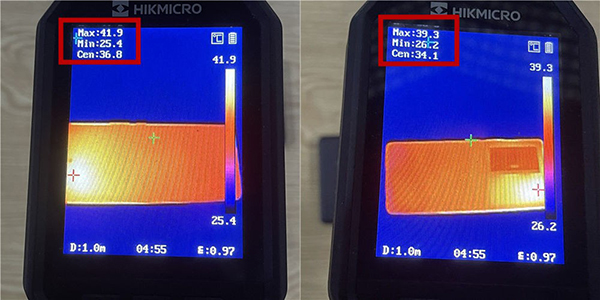 就游戲體驗(yàn)而言,就算是開了性能模式,手機(jī)的機(jī)身溫度都不算燙,一局《王者榮耀》加三輪《原神》測(cè)試結(jié)束后,我們用熱敏溫度對(duì)機(jī)身溫度進(jìn)行測(cè)溫,可以發(fā)現(xiàn)正面大部分區(qū)域的溫度都只有37℃左右,最高溫度41.9℃,背面溫度整體還更低,最高溫度只有39.3℃。