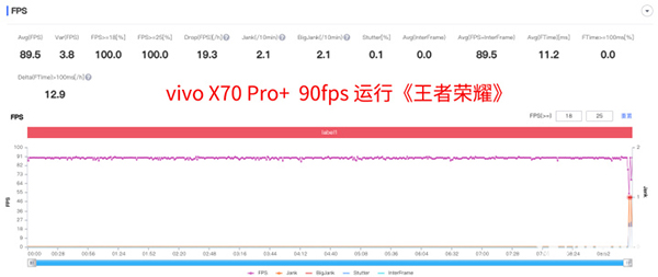 首先,我們讓vivo X70 Pro+運行熱門網游《王者榮耀》,結果如上圖所示,vivo X70 Pro+可以輕松做到全程90fps運行《王者榮耀》,即使復雜團戰(zhàn),也沒有出現(xiàn)大的幀率波動。