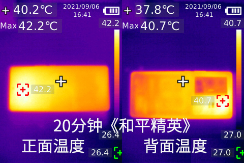 溫度方面,由于《和平精英》的畫面較為復雜,持續(xù)運行20分鐘時,vivo X70 Pro+機身正面最高溫為42.2℃,背面最高溫度為40.7℃,摸上去僅有溫溫熱的狀態(tài),絲毫不影響使用,不得不讓人驚嘆vivo X70 Pro+巧妙的硬件堆疊對散熱的控制力之強。