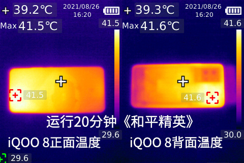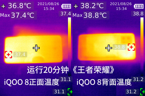 在游戲的同時(shí)我們也測(cè)試了iQOO 8的溫度,結(jié)果如上圖所述,持續(xù)運(yùn)行《王者榮耀》20分鐘時(shí),iQOO 8機(jī)身正面最高溫為37.4℃,背面最高溫度為38.8℃。從這一點(diǎn),可以感受到iQOO 8強(qiáng)悍的散熱能力。