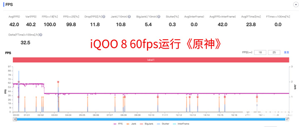 隨后,我們又測(cè)試了iQOO 8 60fps運(yùn)行《原神》,結(jié)果如上圖所示,在前兩分鐘iQOO 8可以保持60fps運(yùn)行《原神》,此后,就將幀率壓到了40fps。盡管并沒(méi)有做到全程滿幀運(yùn)行,但是考慮到《原神》“性能吞噬獸”的惡名,可以沒(méi)有大的幀率波動(dòng),全程40fps+運(yùn)行《原神》,足以說(shuō)明iQOO 8的性能足夠優(yōu)秀。