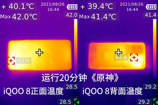 與運(yùn)行《王者榮耀》、《和平精英》相同,到了《原神》環(huán)節(jié),iQOO 8的溫度控制依舊非常給力,持續(xù)運(yùn)行《原神》20分鐘時(shí),iQOO 8機(jī)身正面最高溫僅為42℃,背面最高溫度僅為41.4℃,依然是溫溫?zé)岬臓顟B(tài)。