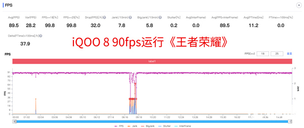 首先,我們讓iQOO 8運(yùn)行熱門(mén)網(wǎng)游《王者榮耀》,結(jié)果如上圖所示,iQOO 8可以輕松做到全程90fps運(yùn)行《王者榮耀》,即使復(fù)雜團(tuán)戰(zhàn),也沒(méi)有出現(xiàn)大的幀率波動(dòng)。