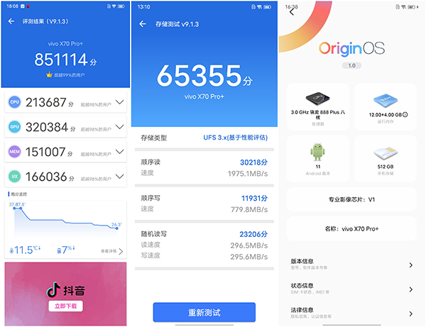 在安兔兔跑分成績則超過了85萬分。而LPDDR5運(yùn)存的理論吞吐數(shù)據(jù)可讓用戶的應(yīng)用調(diào)取與緩存速度大大提升。配合UFS?3.1閃存,vivo?X70?Pro+的下載、拷貝、應(yīng)用安裝、游戲和文檔的讀取都會(huì)更快。?