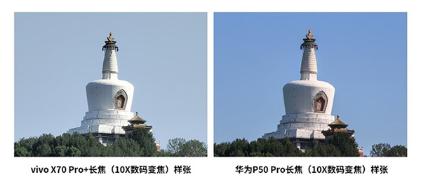由于兩部機型的長焦鏡頭焦段不同,在本次對比中選擇了在原始長焦焦段和10X變焦模式兩種條件下進行成像效果對比。通過對比兩部手機的10X長焦模式下的成像效果,可以看到雖然華為P50 Pro的光學長焦焦段比vivo X70 Pro+更短,但是其傳感器像素量遠高于vivo X70 Pro+,因此華為P50 Pro的畫面細節(jié)表現(xiàn)更為出色。