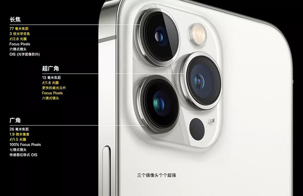 iPhone 13 Pro與iPhone 13 Pro Max搭載了Pro級(jí)別的1200萬(wàn)像素?cái)z像頭系統(tǒng)(長(zhǎng)焦,廣角,超廣角都是1200萬(wàn)像素),長(zhǎng)焦光圈為F2.8,廣角光圈為F1.6和超廣角的F1.8光圈和120°視角。支持3倍光學(xué)變焦(放大)以及0.5倍超廣角光學(xué)變焦,既擁有6倍光學(xué)變焦距離,最高可達(dá)15倍數(shù)碼變焦。在拍攝微距近物,細(xì)節(jié)擁有大幅度提升。