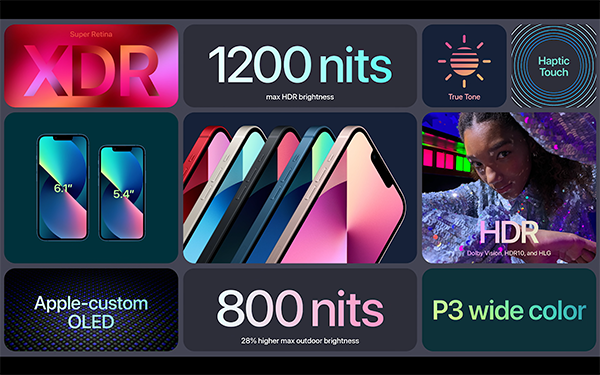 也就是說,蘋果iPhone 13全系在屏幕上的劉海終于得到了縮小。劉海相較于之前縮小了20%.而在屏幕刷新率上,iPhone 13 Mini與iPhone 13則是維持在60Hz刷新率,也就是說蘋果iPhone 13和iPhone 13 Mini不支持高刷新率,屏幕材質為Apple-custom OLED,屏幕分辨率達到了Super Retina XDR級別,屏幕亮度為800尼特,增加了28%的亮度,而HDR最高峰值亮度可達1200尼特。支持P3廣色域。