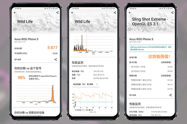 3DMARK是測(cè)試手機(jī)GPU性能的軟件,其中的Sling Shot Extreme是針對(duì)最新高端智能手機(jī)的一項(xiàng)基準(zhǔn)測(cè)試,而當(dāng)我切換至這個(gè)項(xiàng)目時(shí)提示我“你的Asus ROG Phone5對(duì)于此測(cè)試來說太強(qiáng)勁了,我們建議使用WildLife”。一臉懵逼的我跑了一下測(cè)試,結(jié)果顯示總體分?jǐn)?shù)達(dá)到極限值!我又一臉懵逼的找到了WildLife,這是一個(gè)跨平臺(tái)的基準(zhǔn)測(cè)試程序,用于對(duì)比最新移動(dòng)設(shè)備的圖形性能。騰訊ROG游戲手機(jī)5s在3D MARK Wild Life測(cè)試項(xiàng)目中得分5877分。值得一提的是,在整個(gè)測(cè)試過程中,手機(jī)溫度基本維持在36℃左右,散熱性能可見一斑。