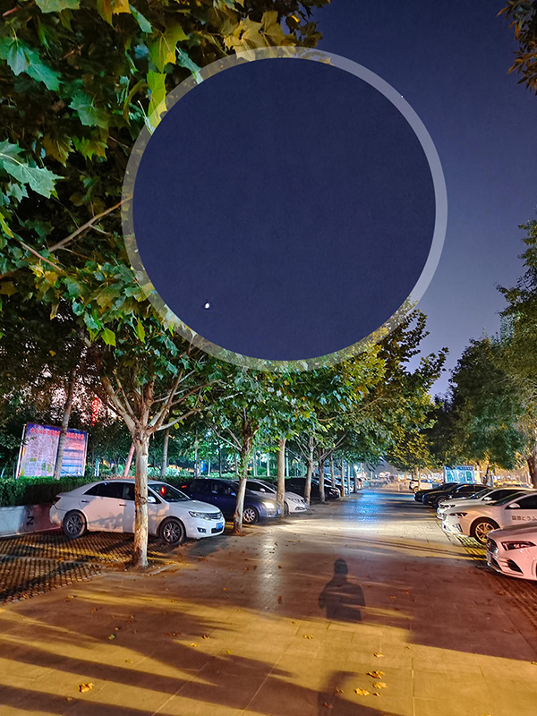 相比白天優(yōu)秀的成像效果,騰訊ROG游戲手機(jī)5s的夜景成像稍微遜色一點(diǎn),對(duì)燈光的高光部分和暗部噪點(diǎn)的抑制差強(qiáng)人意。在下圖中,右上角的天空能看到一些噪點(diǎn),汽車(chē)的燈光有些外溢。