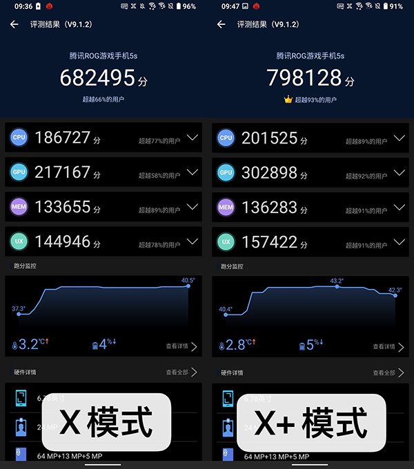 使用5nm制程的驍龍888plus芯片無疑是ROG游戲手機5s在硬件上及其能打的原因。經(jīng)過幾天的試用,我發(fā)現(xiàn)ROG 5s是快,但是快的不好衡量,所以干脆還是老老實實跑個分。在普通的X模式,安兔兔3D得分682495分,正常水平。但是如果外掛了酷冷風(fēng)扇,ROG 5s就可以解鎖真正的狂暴模式,X+模式,不僅得分飆升至798128,測試溫升更是減少了0.4℃,這也從側(cè)面反映了酷冷風(fēng)扇真的不僅酷而且冷。
