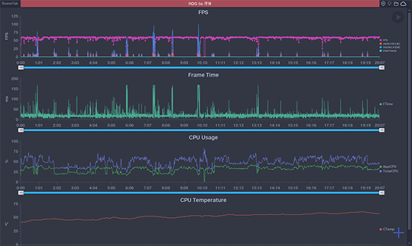 從滿電狀態(tài)開始,在20分鐘X+模式游玩過程中,“原神”幀頻基本維持在60FPS,雖然CPU溫度一度達到了60℃,CPU和GPU頻率也沒有明顯的下降。