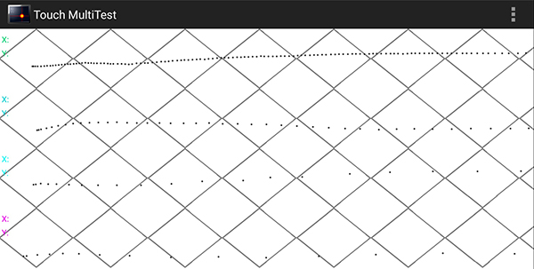 使用Touch MultiTest繪制不同速度的采樣點曲線,可以看到采樣速度還是相對均勻的,即使在極高速(亂畫)的情況下,采樣點分布也能很好地跟上手速。