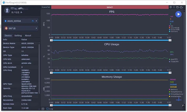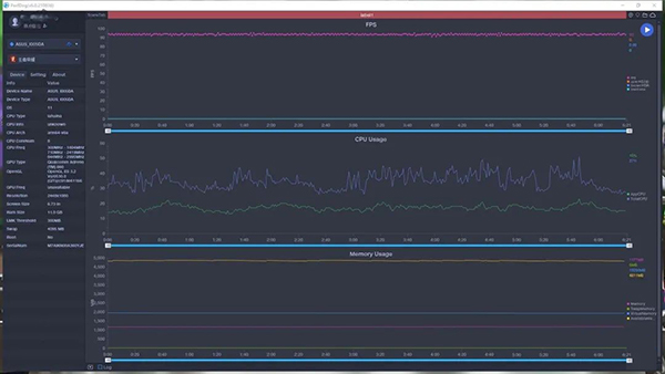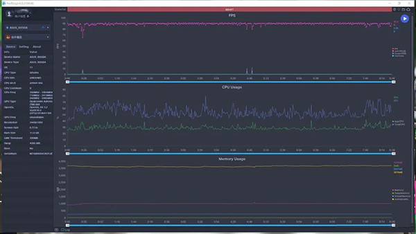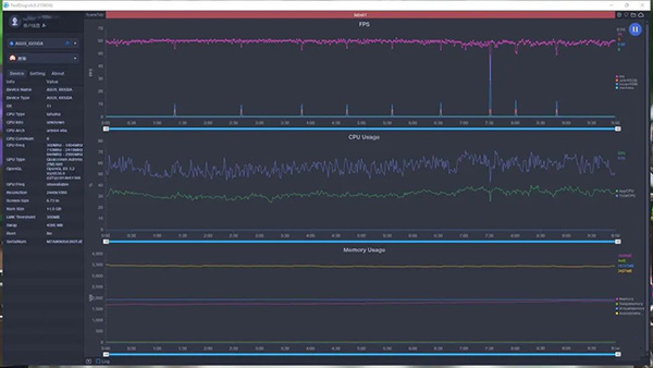 在出現(xiàn)警告的極限畫質(zhì)設定下直接進行實測,從測試數(shù)據(jù)不難看出,在運行這款游戲的時候,數(shù)據(jù)波動明顯大于前面三款游戲,總計運行10分鐘主線任務,基本都穩(wěn)定在50-60幀之間。在7分30秒時觸發(fā)人物技能渲染特效時體現(xiàn)出較大幀數(shù)波動,不過只掉1幀在實際游戲操作中并沒有察覺到卡頓現(xiàn)象,證明ROG 5S完全可以應對這種苛刻的高負載運行。
