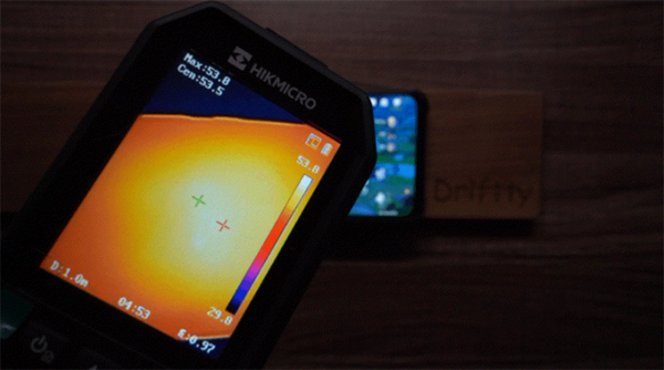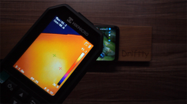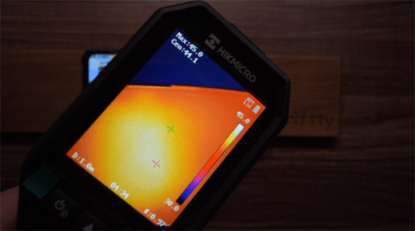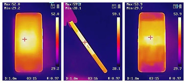 以上面測得溫度最高的《原神》運行時為例,從熱成像儀可見ROG 5S高負載運行游戲期間的發(fā)熱情況,左側手機正面最高溫度52℃,熱量主要集中在中間偏上位置。中間圖側邊接口位置溫度接近60℃,也是整個手機熱量最高的地方,應該是由于Type-C接口為金屬材質(zhì)將內(nèi)部熱量進行傳導所致,右側圖背部位置溫度則為53.9℃。