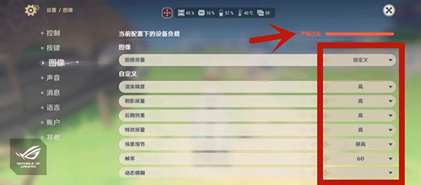 如果覺得上面的三款游戲體量太小,不足矣體現(xiàn)ROG 5S的極限性能,那我們來個高負載測試,直接運行手機游戲的畫質(zhì)終結者《原神》,到目前為止市面上沒有幾款手機可以特效全開流暢運行這個游戲,之前還聽過有人為了玩《原神》專門將原本的旗艦機型換成游戲手機。注意上圖,在自定義畫質(zhì)模式下所有特效全開到最高,此時右上角會提示“調(diào)校嚴重過高”。
