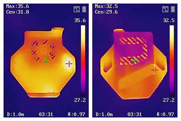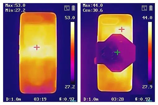 酷冷風扇接觸手機一側為平面設計,風扇內(nèi)外兩側綠色標識為相同位置,測得內(nèi)外溫差為3℃,里熱外冷,實時證明通過風扇加速手機表面空氣流通,帶走熱量同時替換新的外部空氣進入手機內(nèi)部散熱風道,這種通過加速空氣循環(huán)從而實現(xiàn)物理降溫的原理,經(jīng)測試實際散熱效果非常明顯。