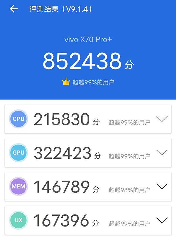 紙面性能如何?安兔兔評(píng)測(cè)顯示,vivo X70 Pro+總分?jǐn)?shù)為852438分,其中CPU、GPU以及UX三大子項(xiàng)成績(jī)均超越99%的測(cè)試機(jī)型。