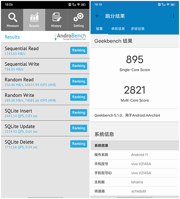 Geekbench 4測(cè)試中,單核得分895、多核得分2821,結(jié)合安兔兔評(píng)測(cè)結(jié)果來(lái)看,vivo X70 Pro+的綜合性能極為強(qiáng)悍,暢玩市面主流手游基本無(wú)壓力。