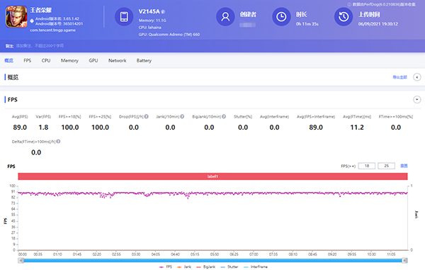 先看《王者榮耀》幀率監(jiān)測(cè)數(shù)據(jù)。vivo X70 Pro+在為時(shí)11分鐘35秒的5V5匹配對(duì)局中,平均幀率保持在了89.0幀。同時(shí),隨著游戲時(shí)間的增加,vivo X70 Pro+并沒(méi)有出現(xiàn)幀率斷崖下跌的情況,全局最低幀率沒(méi)有掉出80幀,可見(jiàn)驍龍888 Plus處理器全程都能輸出高性能,而vivo對(duì)于這顆處理器的調(diào)校功力也超出預(yù)期。